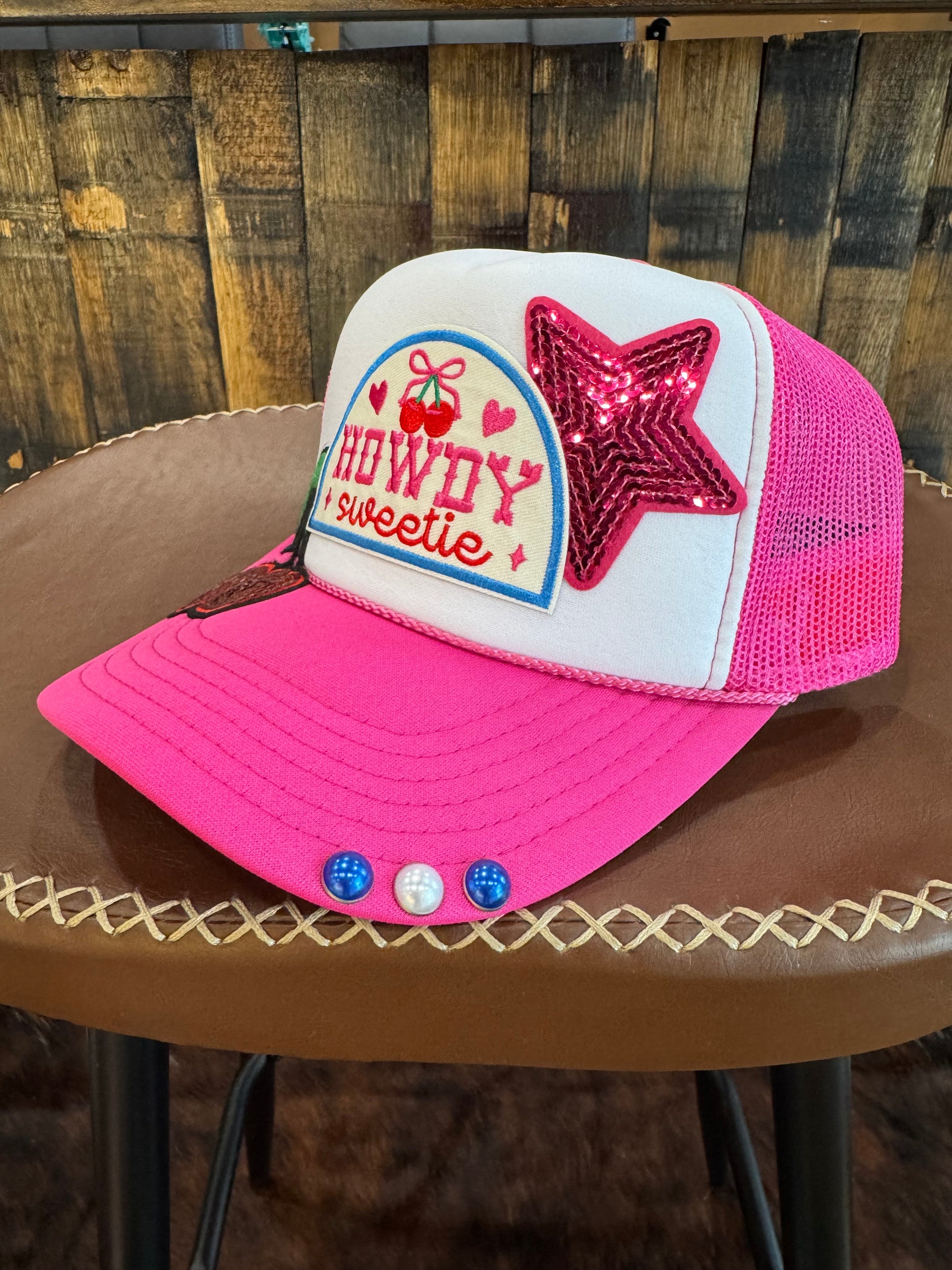 Custom Howdy Sweetie Patch Trucker Hat. Embellished on the brim.
