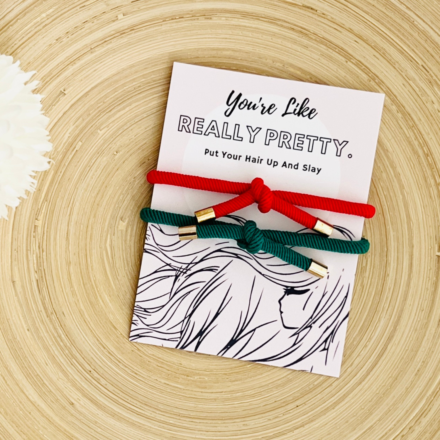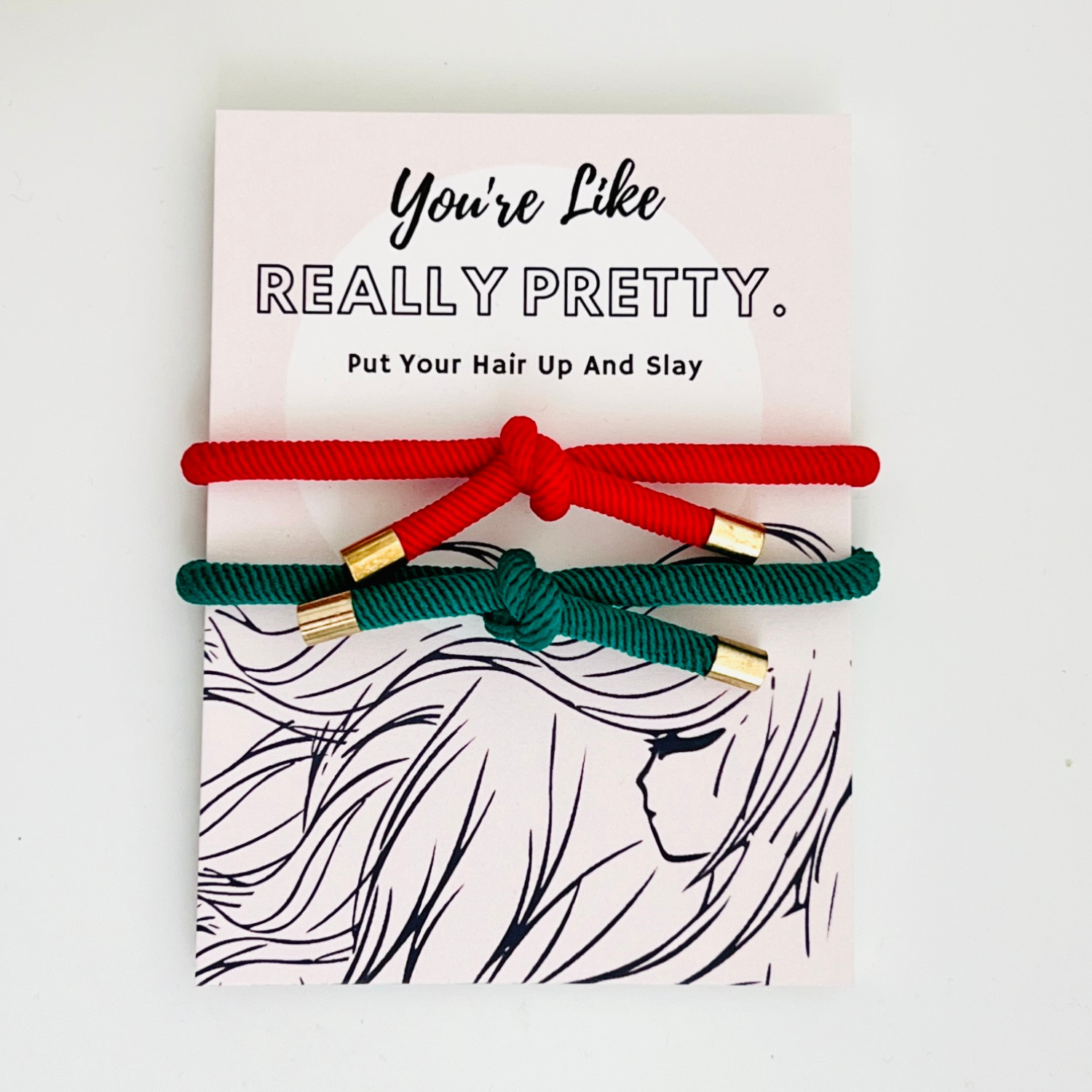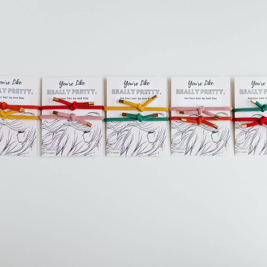 "You're Like, Really Pretty" Hair Tie Sets come with our strong and sturdy go-to elastic hair ties. Your girls are gonna love these as Thank You Gifts. These are double hair ties, installed on a card.