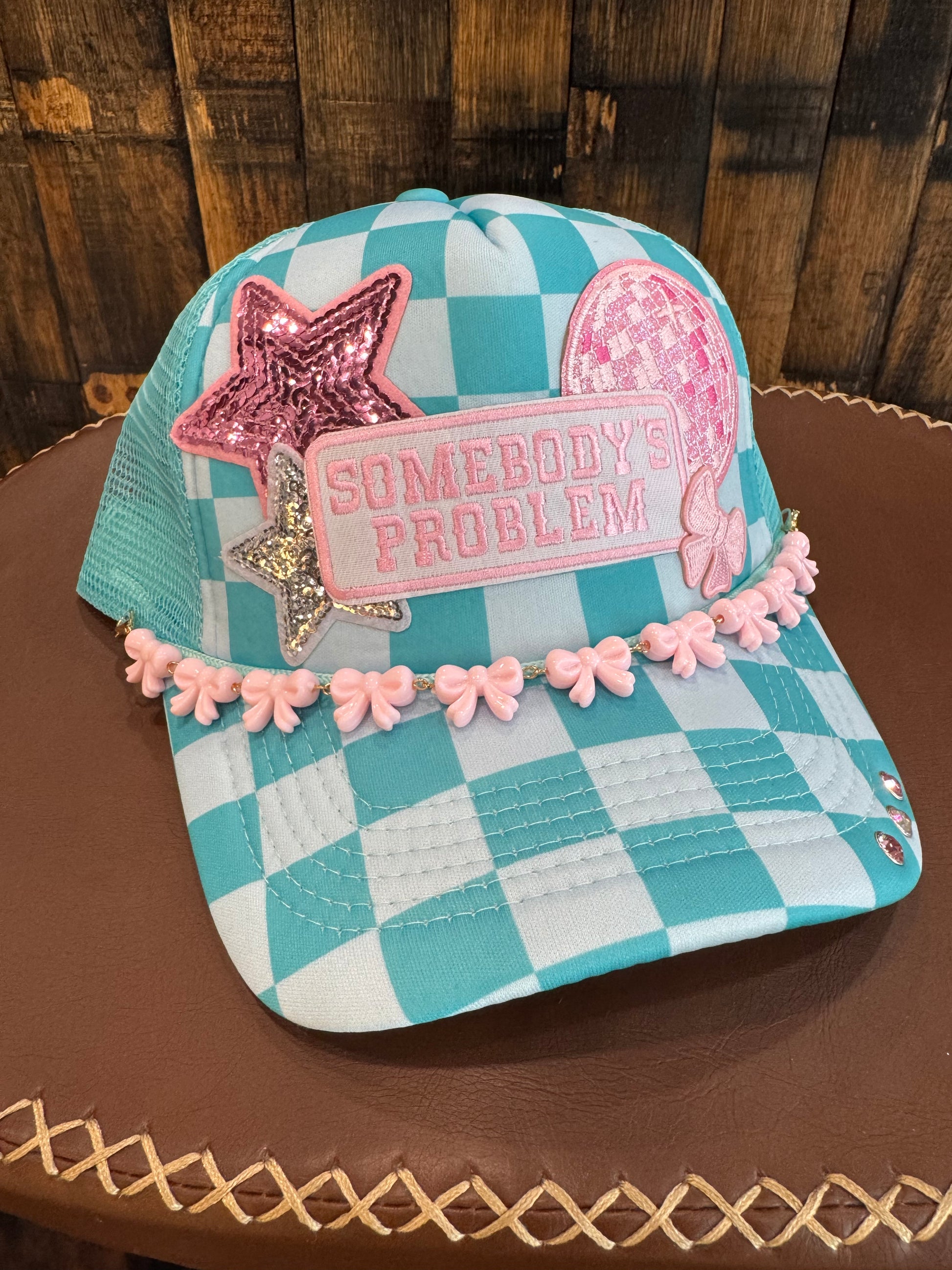 Custom Teal Checkerboard Trucker Hat. Cute Pink Bow Hat Chain attached and Embellished with jewels on the brim.