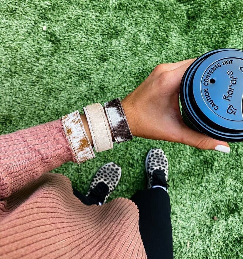 Statement cowhide leather cuff featuring statement hair-on hide with leather backing. Leather backing will either be tan, black or brown. Silver metal snap button closure.