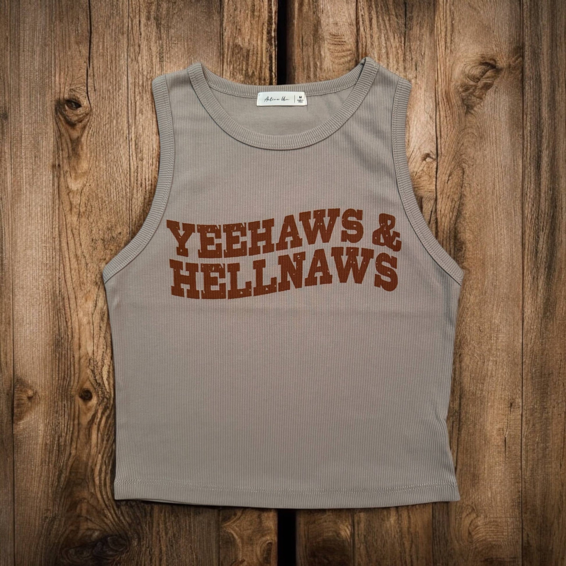A bold tan tank top with the playful phrase “Yeehaws & Hellnaws ” printed across the front. Made from soft, breathable fabric, this tank combines comfort with attitude. Perfect for a fun, casual look, whether you're headed to a country concert, a laid-back BBQ, or just feeling a little bit wild.